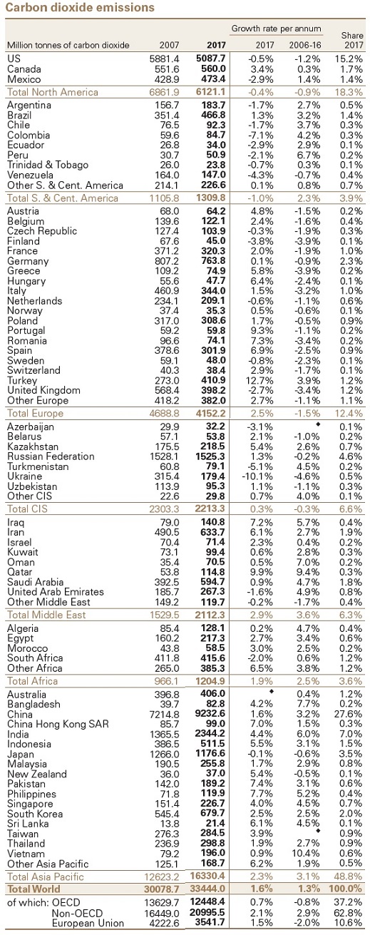US emissions of carbon have been falling, while nations in the Asia-Pacific region have already become the main contributors to the rise in atmospheric carbon dioxide. These and other conclusions are apparent from the BP Statistical Review of World Energy (June 2018), a useful annual compilation of global trends in energy production, consumption, and prices.