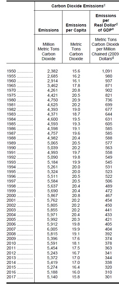 For some more US-specific data, here’s some data from the Monthly Energy Review (June 2018) published by the US Energy Information Administration. This table shows total carbon emissions for the US, emissions per capita, and emissions relative to GDP, going back to 1950.