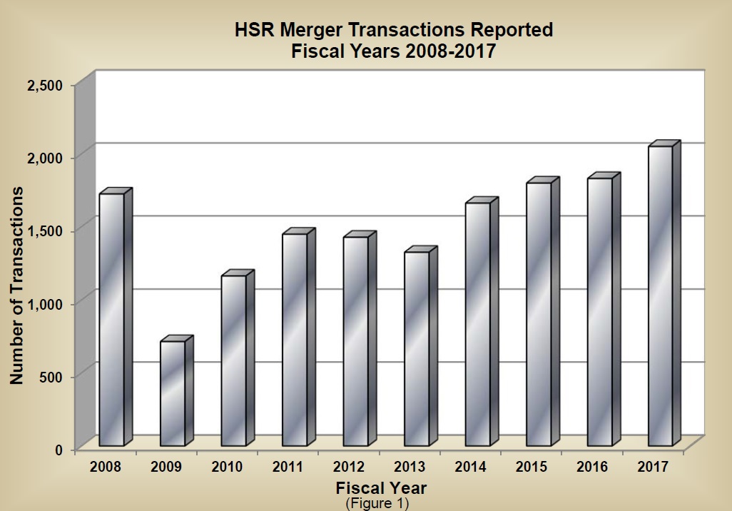 For example, here’s a figure showing the total number of mergers and acquisitions reported. The total has been generally rising since the end of the Great Recession in 2009, but there was a substantial from 1832 transactions in 2016 to 2052 transactions in 2017. Just before the Great Recession, the number of merger transactions peaked at 2,201, so the current level is high but not unprecedented.
