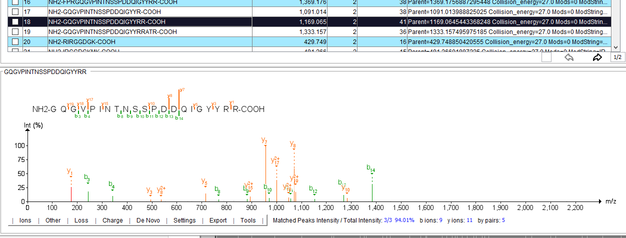 For this peptide, Prosit predicts that for a CE of 27 I’m not going to see every b/y ion. There are some bonds that it thinks, from the hundreds of thousands of real peptides it has studied, just won’t fragment well.