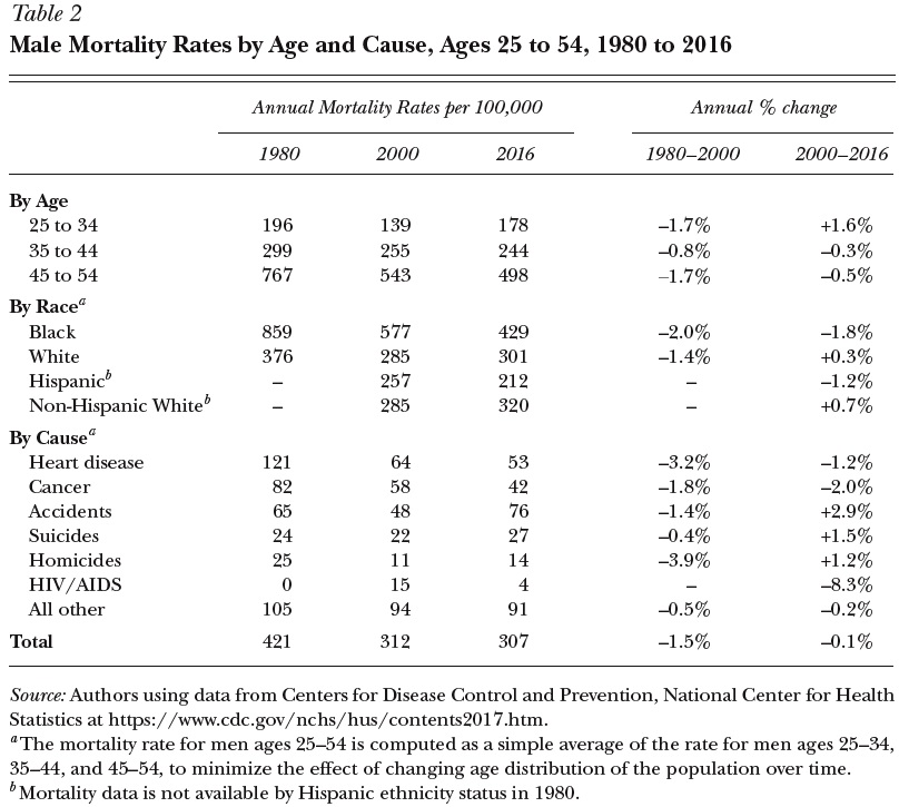 The economic progress of US men has stagnated in recent decades. The labor force participation rate of men ages 25-54 peaked in the mid-1960s and has declined since then (according to the Bureau of Labor Statistics), while men’s real median earnings have been flat since the early 1970s. These population averages mask considerably larger declines in participation among less-educated and non-white men as well as substantial increases in wage inequality. In this paper, we seek to illuminate the broader context in which prime-age men are experiencing economic stagnation. We explore changes for prime-age men over time in education, mortality, morbidity, disability program receipt, family structure, and incarceration rates. We focus on prime-age men, namely those ages 25-54, and on the years 1980-2016 (or 2017 when possible), encompassing much of the period of reduced economic progress for low-skilled men.