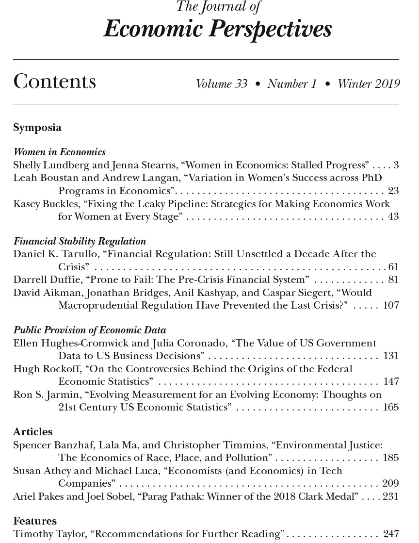 I was hired back in 1986 to be the Managing Editor for a new academic economics journal, at the time unnamed, but which soon launched as the Journal of Economic Perspectives. The JEP is published by the American Economic Association, which back in 2011 decided–to my delight–that it would be freely available on-line, from the current issue back to the first issue. Here, I’ll start with the Table of Contents for the just-released Winter 2019 issue, which in the Taylor household is known as issue #127. Below that are abstracts and direct links for all of the papers. I may blog more specifically about some of the papers in the next week or two, as well.